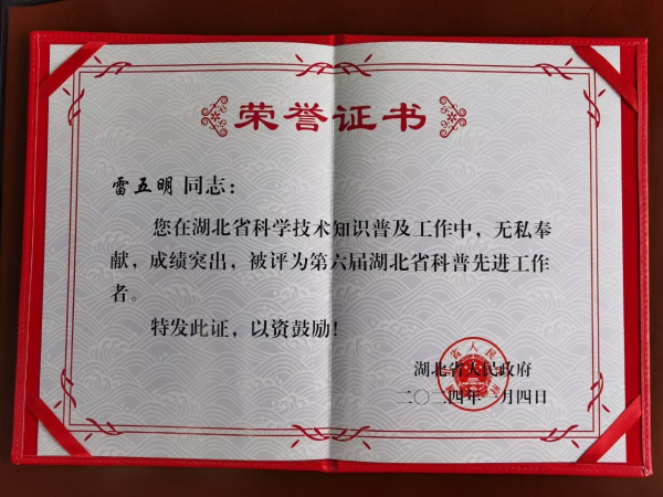 此前,雷五明老师因其在科普工作中的突出贡献被评为第六届湖北省科普先进工作者,受到湖北省人民政府表彰。