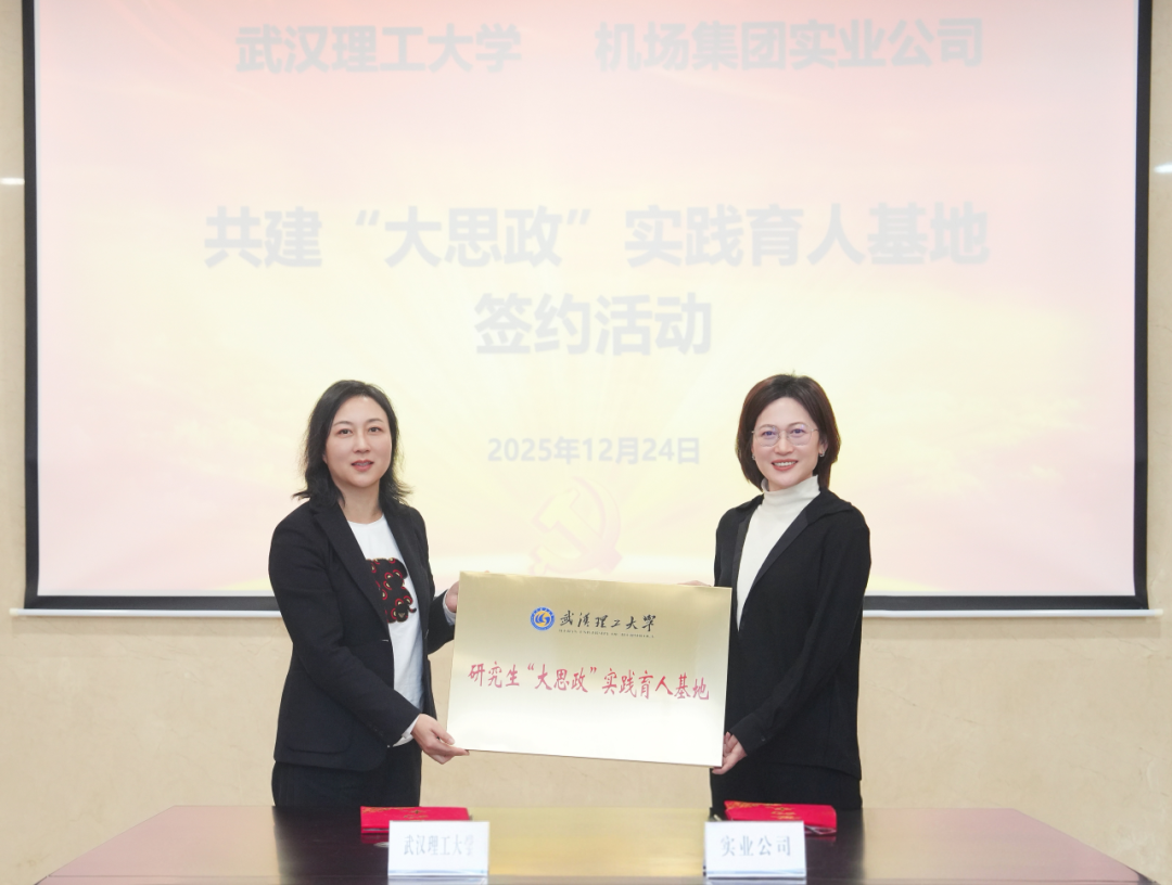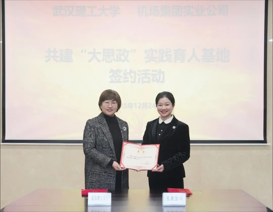为深入贯彻落实习近平新时代中国特色社会主义思想,充分发挥高校思想政治教育与企业实践育人优势,深入推进学校研究生大思政工作,12月24日上午,学校与湖北机场集团实业发展公司共建研究生“大思政”实践育人基地签约仪式及授牌活动在武汉天河机场公务机楼举行。湖北机场集团党委组织部(人力资源部)部长李蓓,湖北机场集团实业发展公司党委书记、董事长张艳清,学校党委研究生工作部部长王秀梅、马克思主义学院党委副书记黄华莉参加活动及座谈,会议由湖北机场集团实业发展公司党委副书记、总经理陈敏灿主持。