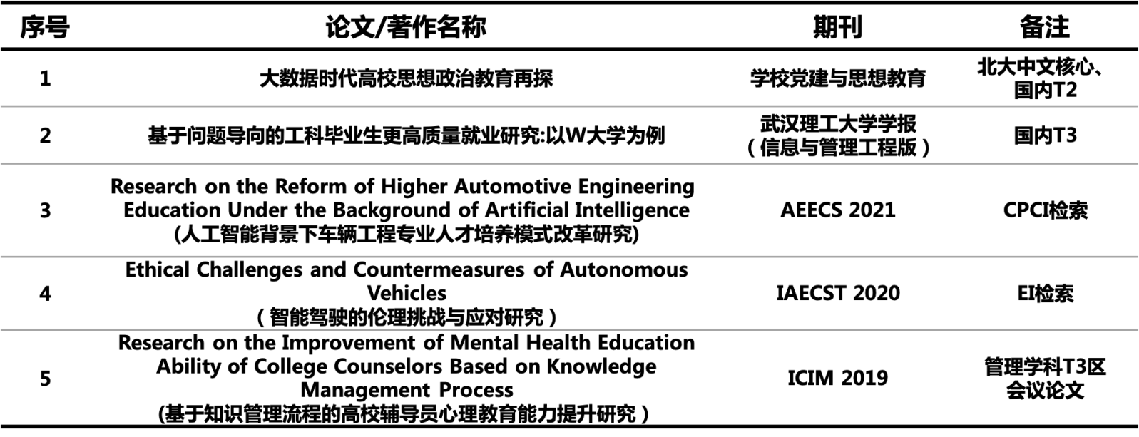 1、2021年,研究报告《数字化新时代面向工科生的教育指导机制与实践》获得湖北省科技信息成果三等奖;