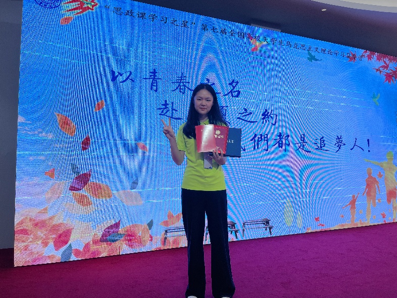 生也有涯,无涯唯智。刘丁清晰地意识到大学学习的自主性,在四年的学习生涯中,她始终保持高涨的学习热情和旺盛的求知欲。为了更好地交流探讨前沿理论,提升学术能力,她参与教育部主办“思政课学习之星”第七届全国高校大学生马克思主义理论学习夏令营,听取10余场名师授课、学术报告、大思政课体验等,采访对话吉林大学孙正聿教授,参与理论座谈获评“优秀营员”。