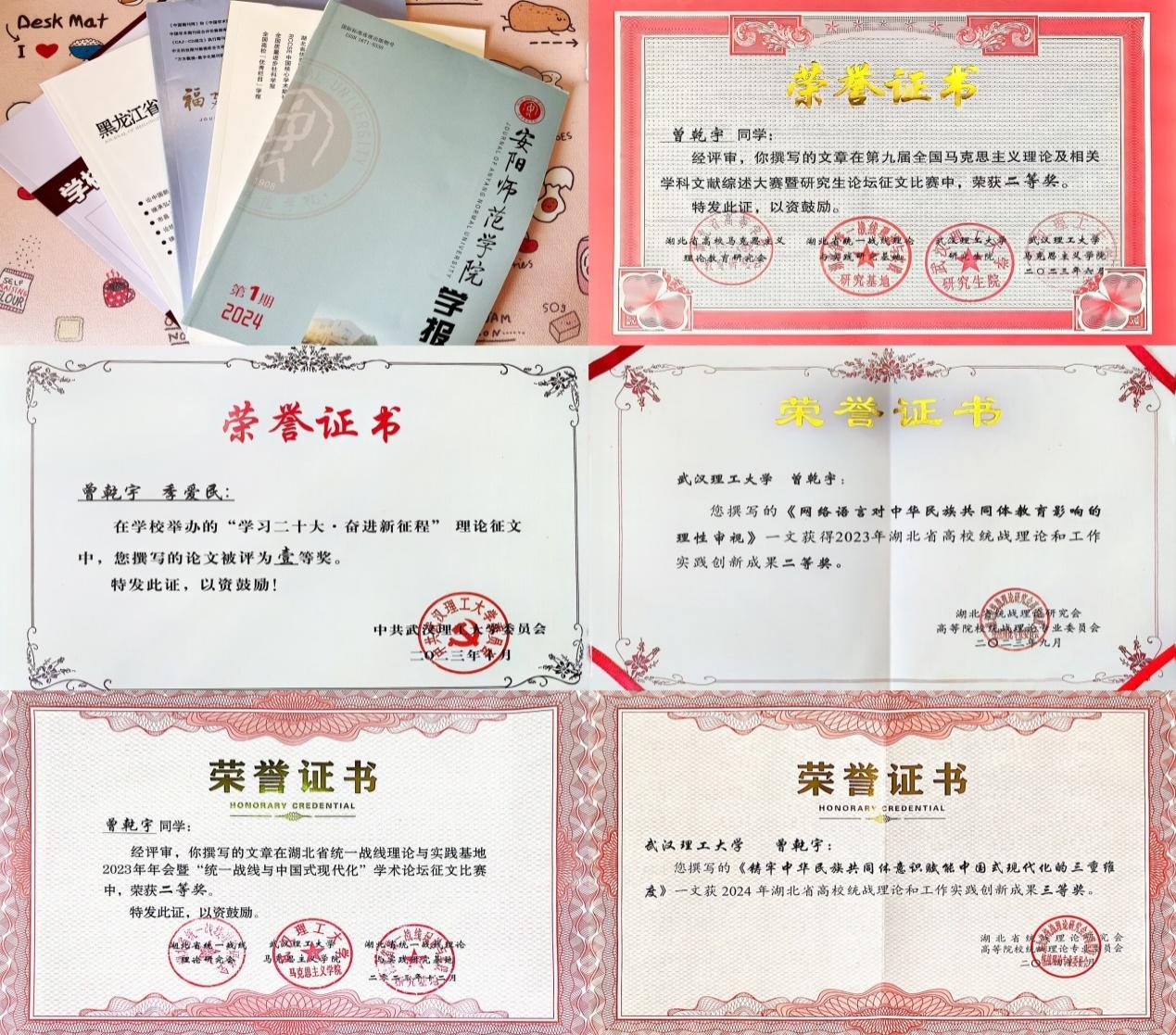 严于律己,善思善悟。她围绕学科专业潜心研究,撰写论文数篇,其中5篇论文公开发表在《学校党建与思想教育》《黑龙江省社会主义学院学报》《安阳师范学院学报》《福建教育学院学报》《汉江师范学院学报》刊物上。论文成功发表后,她并未松懈,而是继续通过日复一日的阅读、思考和写作来沉淀自己,完善知识结构、深化思想认识,探索思想政治教育学科的理论前沿。同时,她也积极参与校内外学术论坛与征文,提升自身学术素养,曾获第九届全国马克思主义理论学科文献综述大赛暨研究生论坛征文二等奖、2023年湖北省高校统战理论和工作实践创新成果比赛二等奖、湖北省统一战线理论与实践基地2023年年会暨“统一战线与中国式现代化”学术论坛征文比赛二等奖、武汉理工大学举办的“学习二十大•奋进新征程”理论征文一等奖、2024年湖北省高校统战理论和工作实践创新成果三等奖。这些学术论坛及征文活动不仅拓宽了她的学术视野,也为她的学术研究奠定了坚实的基础。