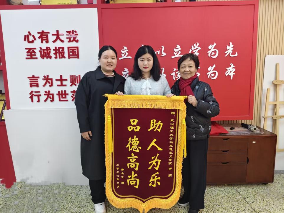 2026年3月24日,一面绣有“品德高尚 助人为乐”的锦旗送到了武汉理工大学马克思主义学院2024级研究生罗颖同学手中。这面锦旗来自一位年过八旬的老人及其家属,感谢罗颖同学在危急时刻挺身而出、救助老人的善举。