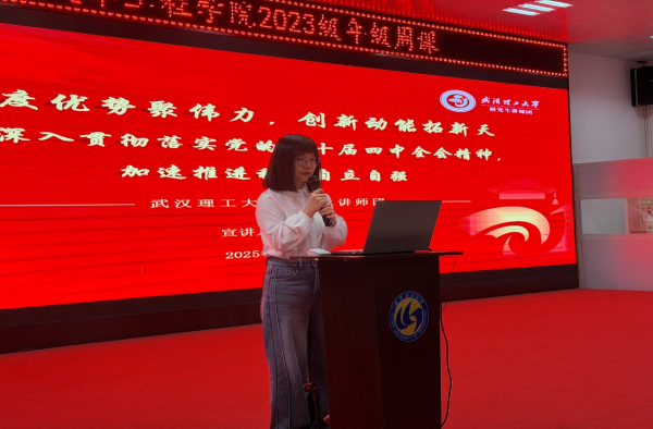 会议伊始,武汉理工大学研究生讲师团成员王宇霞以《制度优势聚伟力 创新动能拓新天——深入贯彻落实党的二十届四中全会精神,加速推进科技自立自强》为题,围绕“时代召唤、制度优势、强国有我”三个方面,深刻阐释了“科技自立自强”的战略方位、“新型举国体制”的制度优势,以及“新质生产力”的创新动能,她号召青年学子要发扬历史主动精神、实干精神,敢啃“硬骨头”,把论文写在祖国的大地上,以科技自立自强汇聚起实现民族复兴的磅礴青春力量。