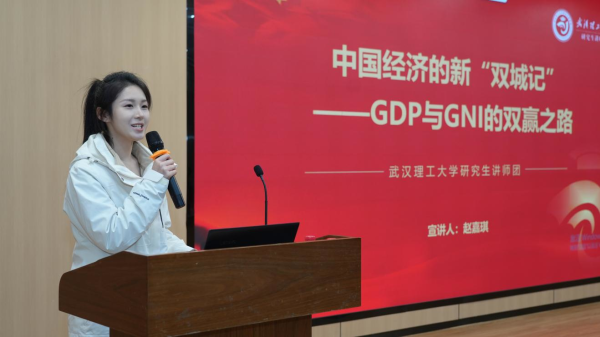 在朋辈宣讲环节,来自11所高校的宣讲团代表依次登台分享。武汉理工大学研究生讲师团成员赵嘉琪以《中国经济的新“双城记”——GDP与GNI的双赢之路》为题,围绕国家经济发展的双视角,系统阐述了生产之城与收益之城辩证统一、相辅相成的紧密关系,号召大家携手并肩,共同续写更加精彩的双城发展新篇章,既让脚下的产业之城根基永固,也让远方的收益之城灯火辉煌。