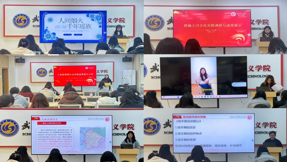 活动伊始,讲师团成员禚家琪、李宜桐、尚雨晗、易芙蓉、陈琳、李萌依次进行了寒假实践活动成果的制作及思路分享。各位成员依次就永州瑶族历史文化、盘王节与长鼓舞传承、恩施土司文化调研、土家族社会实践成果与反思、土家族人物采访实践、湘西土家族历史及特色技艺、摆手舞非遗传播等内容,结合民族习俗、美食、服饰等方面做了分享与汇报。此次分享充分展现了讲师团成员扎根乡土、传承文化的责任与担当,也为后续实践活动开展积累了宝贵经验、凝聚了前行力量。