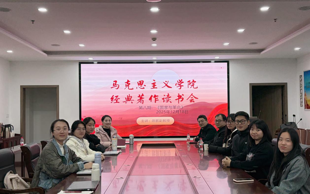 为引导学生深化对马克思主义经典著作的理解,筑牢理论根基,提升辩证思维与批判分析能力,2025年12月18日,马克思主义学院于弘毅楼1207会议室圆满举办本学期第八期马克思主义经典著作读书会。本次读书会以《国家与革命》为核心研读文本,特邀学院陈鹏副教授担任主讲嘉宾,副院长王军教授参与交流研讨。