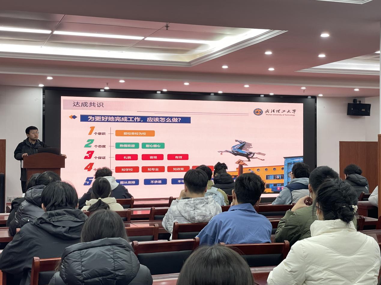 培训最后,丁涛老师重点强调了“寒假母校行”的注意事项、活动技巧及实践任务,并特别提醒,面对学弟学妹、家长、高中老师等不同对象,需精准把握需求差异;交流中需始终以“武理学生”的身份客观答疑,遇到不确定的信息要第一时间向指导老师反馈,确保宣传内容准确规范。