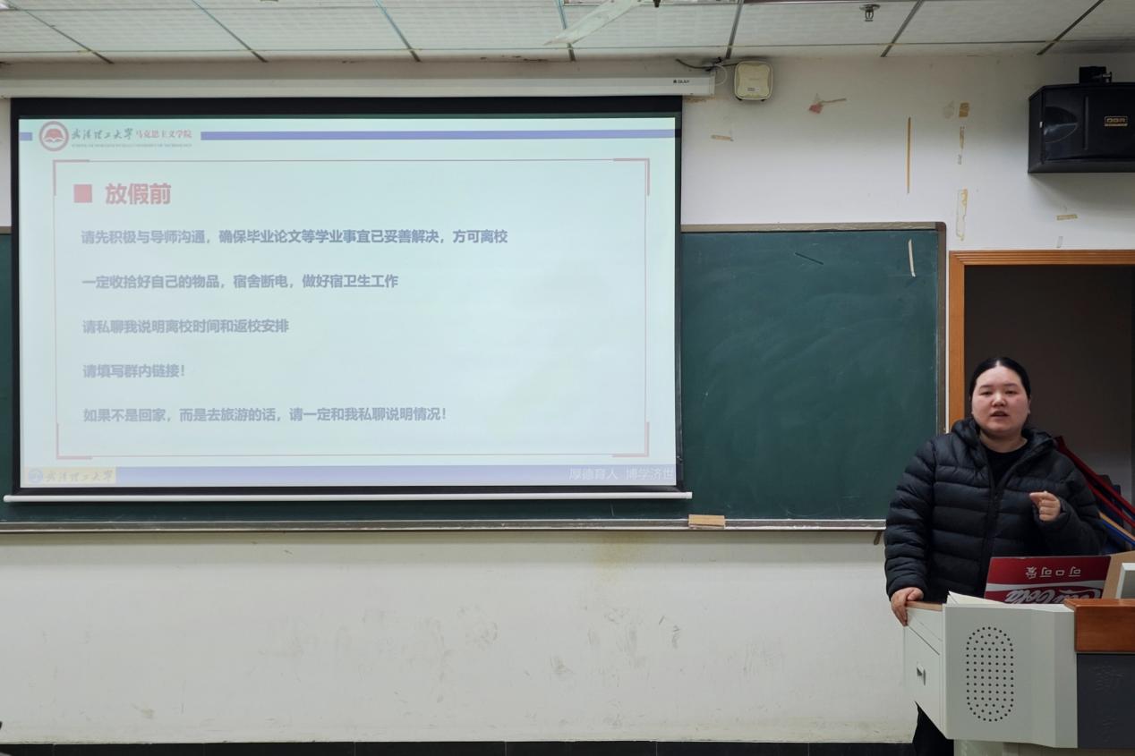 为筑牢假期安全防线,引导研究生科学规划假期学习生活,1月5日下午5点30分,马克思主义学院于弘毅楼713教室举行2024级研究生研学讲堂。本次活动由2024级研究生辅导员陶倩倩老师主持,2024级全体研究生参与学习。