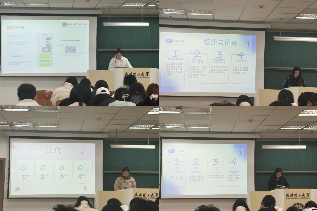 正式述职环节中,研究生会与学生会办公室、宣传部、基础权益部、发展权益部等各部门负责人依次登台,围绕部门工作实绩、特色活动开展、存在问题与改进方向、未来工作计划四个方面,全面汇报2025 年度履职情况。各部门既充分展示培训学习、文体活动、权益服务、社会实践等工作亮点,也实事求是剖析工作短板,明确提出优化措施与2026 年度工作方向,充分展现马院学生干部务实担当、锐意进取的精神风貌。