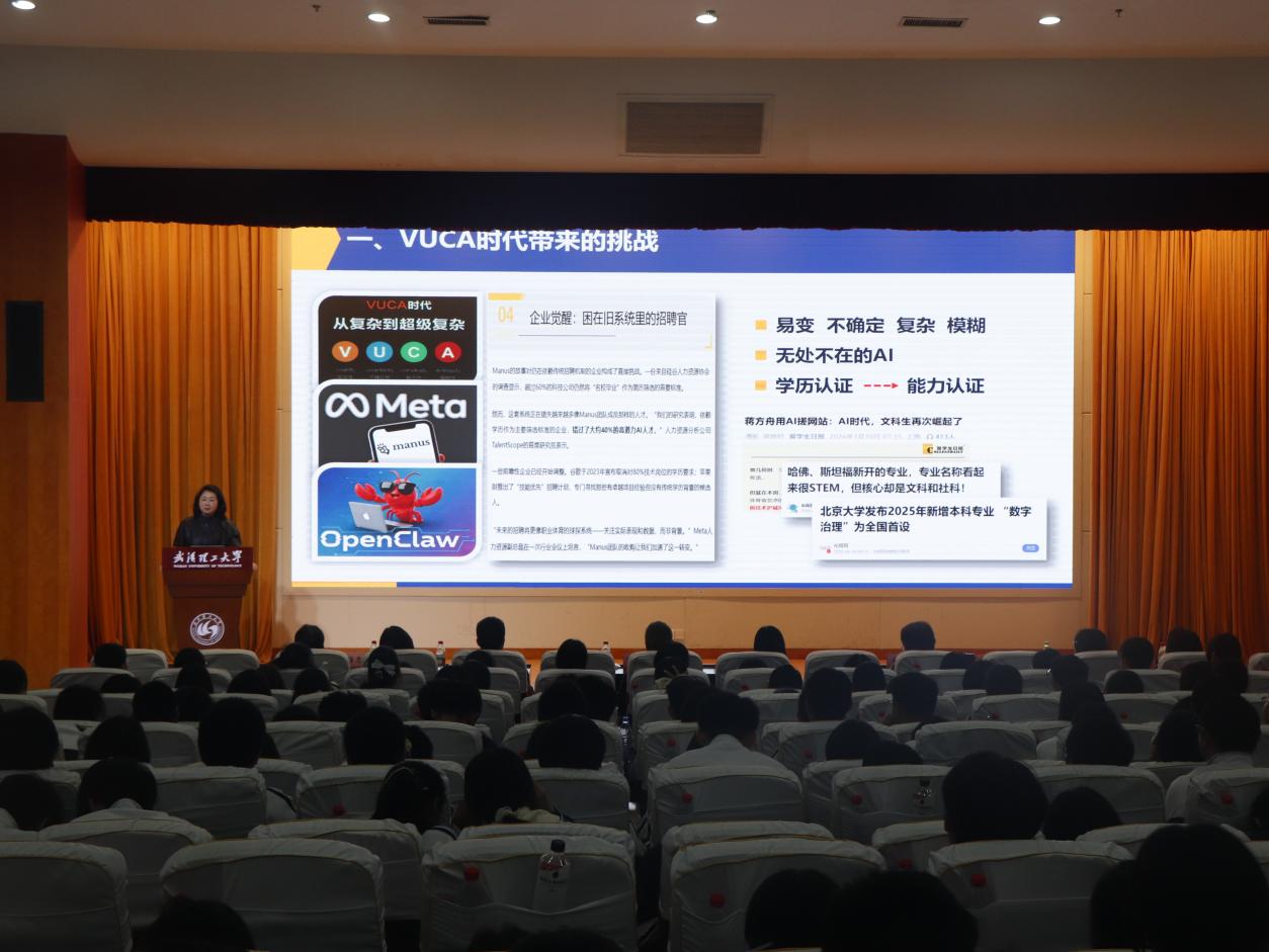 参观结束后,全体师生齐聚马房山西院301会议中心参加生涯规划专题讲座。武汉理工大学马克思主义学院院长雷江梅教授致欢迎辞,向到场师生致以诚挚问候,全面介绍了武汉理工大学、马克思主义学院深厚的办学底蕴、鲜明的办学特色与立德树人的育人理念,充分展现了学校、学院在人才培养、学科建设与社会服务等方面的丰硕成果与责任担当。