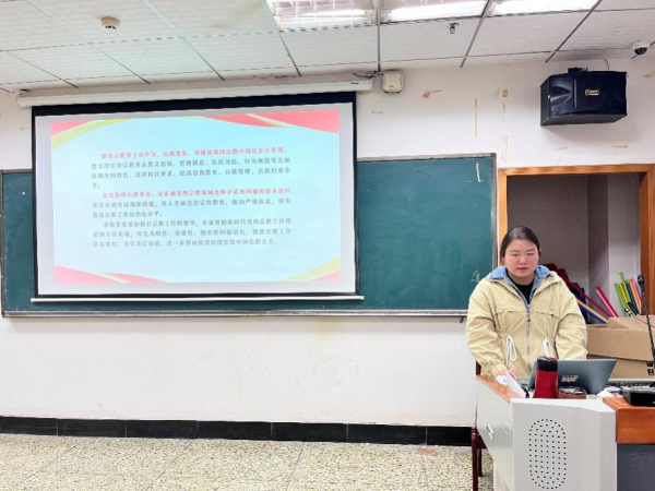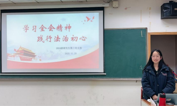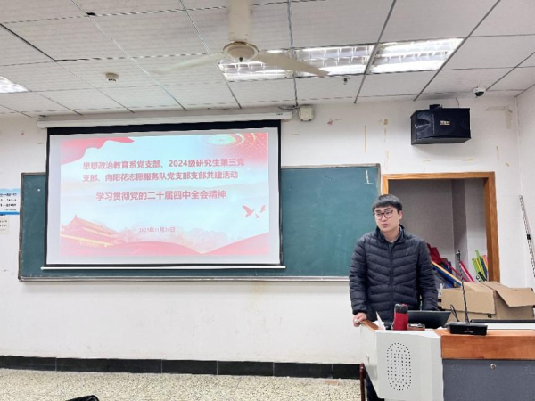 为深化师生交流、强化党建引领。11月20日下午3时,学院2024级研究生第三党支部与思想政治教育系党支部、向阳花志愿服务队党支部于弘毅楼713联合开展“学习贯彻党的二十届四中全会精神”师生支部共建活动。会议由思想政治教育系党支部副书记杨柳青主持,三个支部全体党员参与。