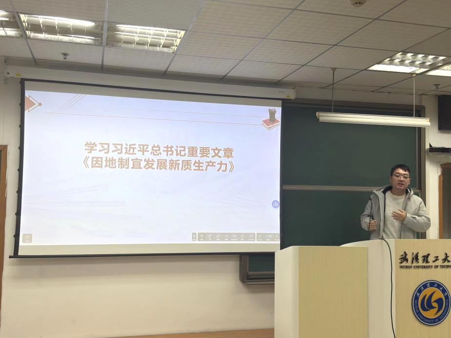 活动第二项,由支部成员贺午鲲带领大家学习习近平总书记重要文章《因地制宜发展新质生产力》相关重要论述。他结合求是网权威解读,系统梳理了习近平总书记关于发展新质生产力“要防止一哄而上、泡沫化,也不要搞一种模式”的核心要求,重点解读了尊重发展规律、发挥比较优势、坚持先立后破三大基本准则。他分享道,发展新质生产力不是忽视传统产业,而是要用新技术改造提升传统产业,实现“旧”与“新”的辩证统一。作为新时代研究生党员,要立足专业所长,紧盯学科前沿,在科研创新中找准自身定位,将个人学术追求融入区域发展和国家战略,以实际行动为培育新质生产力贡献智慧力量。