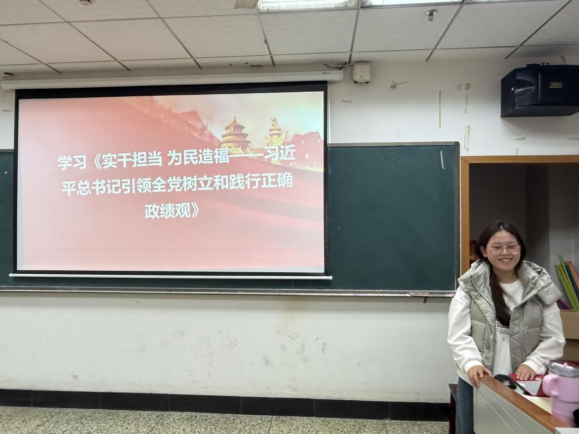 活动第二项,由支部成员李林同志带领大家开展树立和践行正确政绩观专题学习教育,重点学习《习近平关于树立和践行正确政绩观论述摘编》及《实干担当 为民造福——习近平总书记引领全党树立和践行正确政绩观》相关内容。她围绕正确政绩观的核心要义、实践要求和时代内涵,梳理习近平总书记关于树立和践行正确政绩观的重要论述,结合总书记在地方工作期间的生动实践案例,阐释了“政绩为人民所创造、为人民所共享”的根本要求,以及“功成不必在我、功成必定有我”的境界追求。她结合实际分享道,作为新时代青年党员,树立正确政绩观要摒弃急功近利的浮躁心态,在学习上脚踏实地深耕专业,在科研中求真务实勇于创新,在服务同学中真心实意担当作为,以实实在在的行动和成效诠释党员的初心和使命。