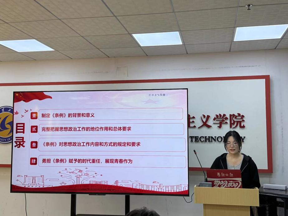 活动第二项,由支部成员王玥婷领学中央宣传部负责人就《中国共产党思想政治工作条例》答记者问。她详细介绍了《条例》制定的时代背景、重要意义、主要框架与核心内容,重点解读了思想政治工作的地位作用、总体要求、主要内容与方式方法。她呼吁大家作为马克思主义理论专业党员,更应增强做好思想政治工作的自觉性与主动性,在理论学习、宣传阐释、价值引领中发挥先锋模范作用,努力成为“政治坚定、业务精通、作风过硬”的思想政治工作骨干,为党和国家事业发展贡献自己的力量。