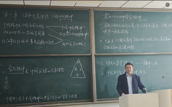 课程伊始,杨成刚老师以视频引入的方式向学生展现了中国精神的磅礴力量与生动实践,引导学生深刻理解“实现中华民族伟大复兴的中国梦,必须弘扬中国精神”。接着,杨成刚老师具体讲解了“什么是精神”以及“中华民族何以形成了崇尚精神的优秀传统”等问题。为激发进一步思考,杨成刚老师围绕“中华民族的优秀传统”与学生展开互动问答,课堂氛围热烈而有序,同学们踊跃发言,从诚实守信到勤俭节约,从孝老爱亲到尊师重道,纷纷阐述自己对优良传统内核的理解。杨成刚老师进一步结合中华优秀传统文化中的思想观点,搭配古圣先贤们的经典论述,深入浅出地阐释了中华民族崇尚精神的优秀传统的三个具体表现。随后,杨成刚老师详细讲述了中国精神的丰富内涵,从伟大创造精神、伟大奋斗精神、伟大团结精神到伟大梦想精神,层层递进,并结合一系列实践案例,生动诠释了中国精神的生命力,使抽象的中国精神变得可感可知。同时,杨成刚老师还紧密结合时事热点,将党的二十届四中全会精神融入到课程中,深入阐释了中国精神的新时代内涵和实践要求。