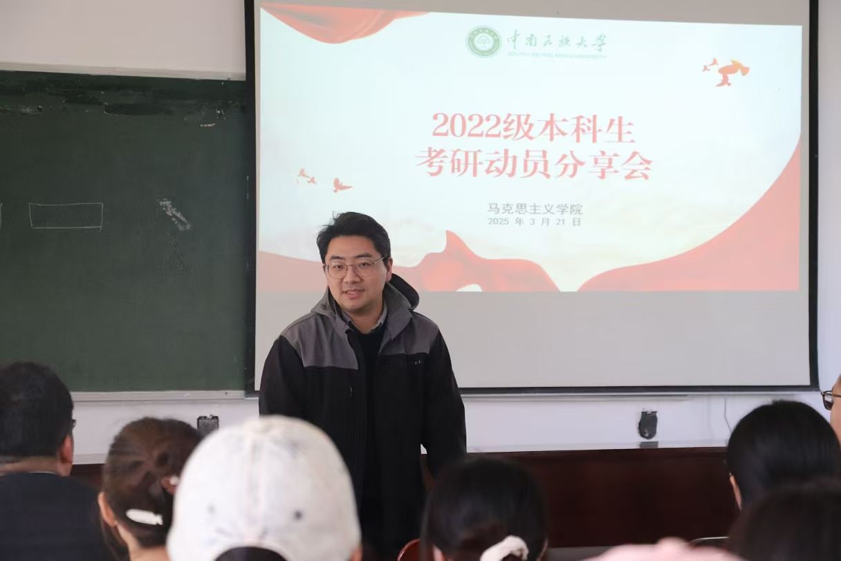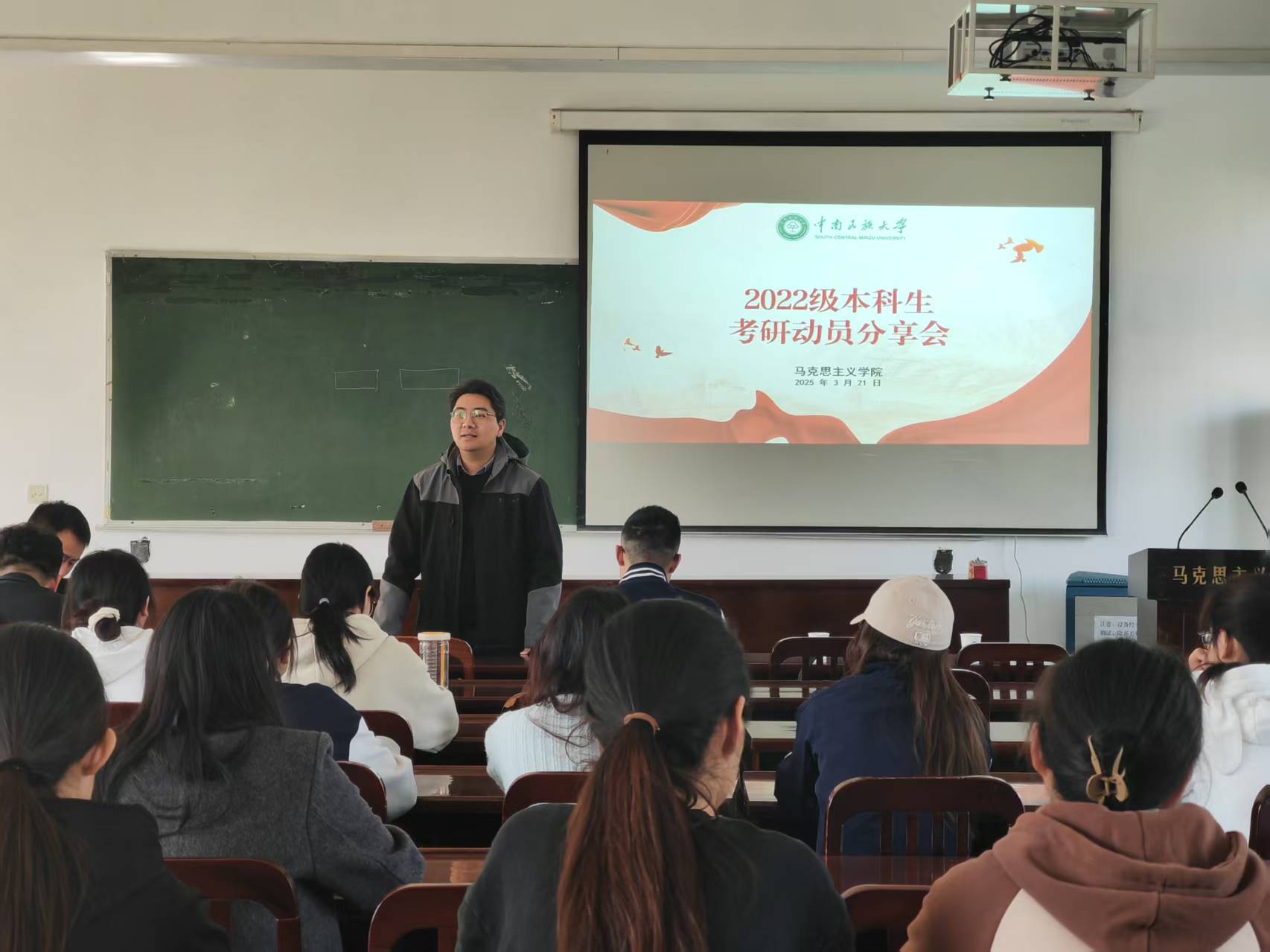 为深化院校合作、加强人才培养衔接,3月21日上午,应中南民族大学马克思主义学院副院长朱磊教授邀请,我院副院长王军教授出席中南民族大学马克思主义学院2022级本科生考研动员分享会,我院研究生谭倩、付琴陪同参加。