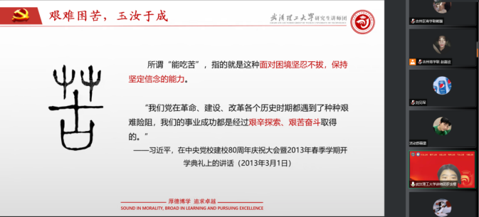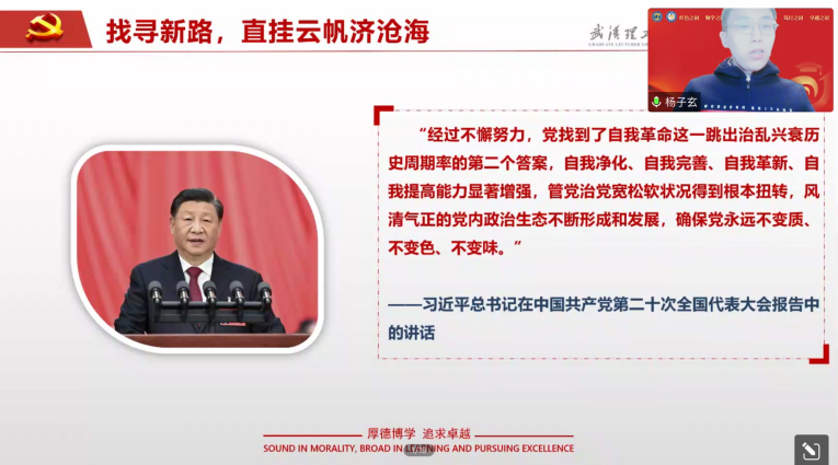 “红色青年从积贫积弱的年代中破壳而出,点燃了火种,他们在列强侵略时顽强抗争,在山河破碎时浴血奋战,在一穷二白时发愤图强,在时代发展中与时俱进,党的百年奋斗征程中始终活跃着他们的身影。青春的力量,青春的涌动,青春的创造,始终是推动中华民族勇毅前行、屹立于世界民族之林的磅礴力量!”12月12日晚,在材料科学与工程学院,党的二十大精神研究生宣讲团成员、研究生讲师团讲师乔奕钦激情澎湃宣讲党的二十大理论,线上的研究生同学们纷纷点赞。
