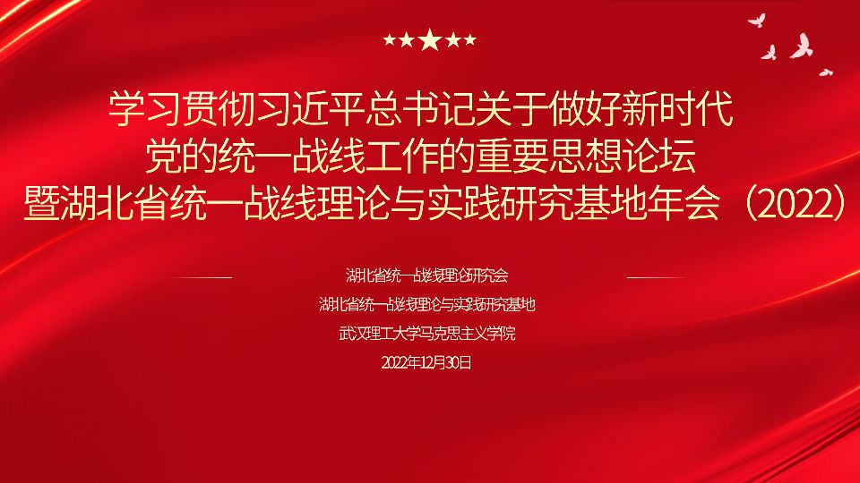 为深入学习贯彻党的二十大精神以及中央统战工作会议精神,深入学习践行习近平总书记关于做好新时代党的统一战线工作的重要思想,12月30日,“学习贯彻习近平总书记关于做好新时代党的统一战线工作的重要思想”论坛暨湖北省统一战线理论与实践研究基地2022年年会在腾讯会议平台举行。此次论坛由湖北省统一战线理论研究会、武汉理工大学马克思主义学院、湖北省统一战线理论与实践研究基地联合举办。湖北省委统战部副部长、湖北省社会主义学院党委书记邵志祥,武汉理工大学党委书记信思金出席论坛并致辞。来自武汉大学、新疆大学、石河子大学、中南民族大学、武汉理工大学、湖北省社科院、山东省社会主义学院、中共汕尾市委党校等单位的专家、学者,以及校内外一百余名在校硕博研究生参与论坛。